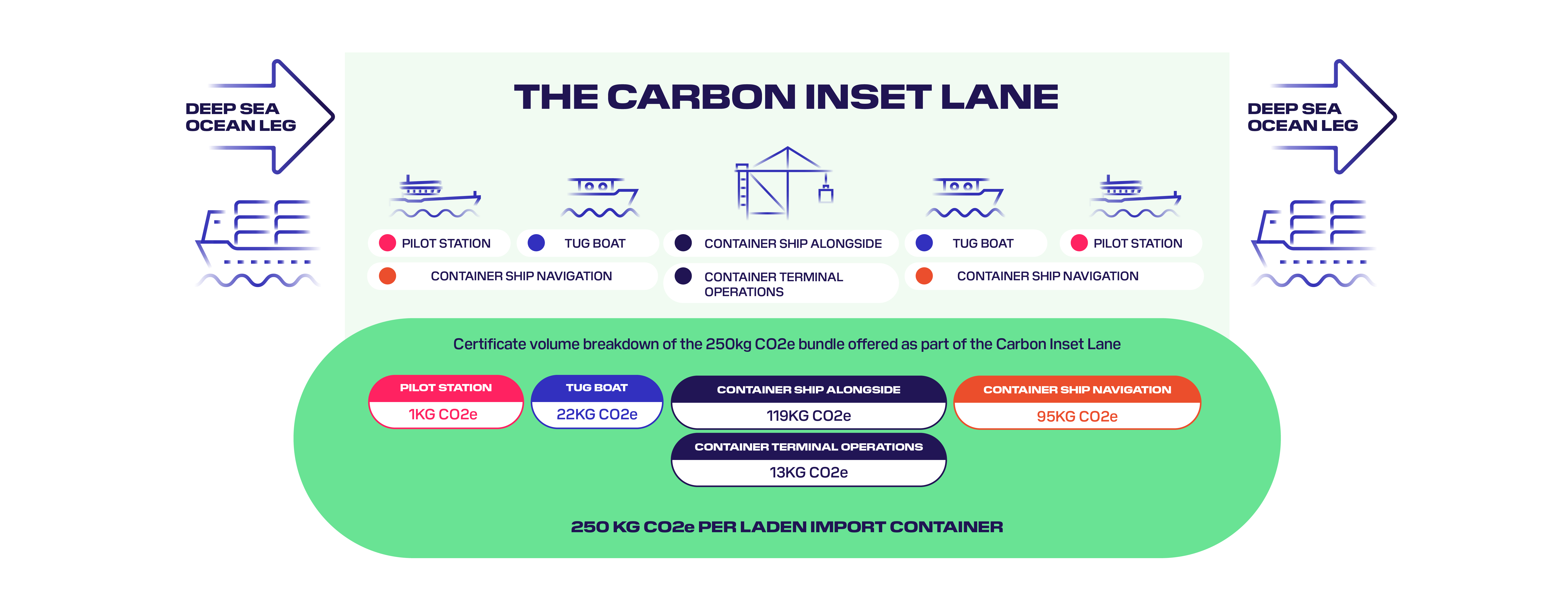 The 250kg CO₂e are a reflection of the various emission sources that are linked to the full port call and handling operations of an import-laden container. The 250kgCO2e is a bundle of marine fuel certificates that cover emission reduction from berthed vessels, tug boats and pilot boats which have now switched to low carbon fuels, and through the low-carbon container handling of DP World Southampton operations. The 250kgCO2e reduction represented by the inset certificates represent a >90% reduction of the estimated total emissions of an average UK port call.